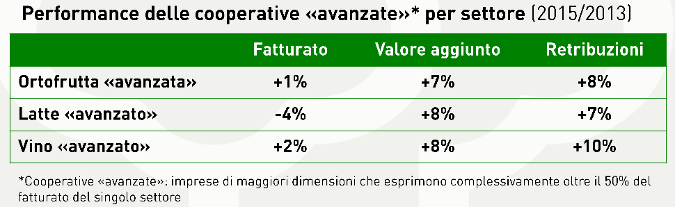 Fra i principali settori cooperativi figurano alcune eccellenze dell'agroalimentare nazionale. Il primato per fatturato generato spetta alla zootecnica da carne (9,2 mld di euro di fatturato nel 2015, pari al 27% di quello della cooperazione agroalimentare italiana associata), cui appartengono alcune imprese leader nazionali nella trasformazione di carni avicole, bovine e suine, che rientrano nella top 50 delle imprese alimentari italiane. Al secondo posto l'ortofrutta (8,4 mld, pari al 24% del fatturato totale), specializzata nella valorizzazione di prodotto fresco e trasformato, seguito dal lattiero-caseario (6,4 mld, 18%), in cui sono presenti imprese del latte alimentare e nella produzione e commercializzazione dei principali formaggi Dop italiani (come Parmigiano Reggiano, Grana Padano, Asiago, ecc.) di cui la cooperazione detiene quote superiori al 60%. Seguono le cooperative dei servizi (5,1 mld, 15%), che svolgono la funzione di vendita di mezzi tecnici, gestione del prodotto e assistenza tecnica per le imprese agricole e le cooperative del vitivinicolo (4,3 mld di euro, 12% del fatturato totale ) che sono fra le maggiori imprese nazionali del settore. In particolare nel ranking delle top 10 aziende vitivinicole italiane rientrano quattro "cooperative avanzate" (con ricavi superiori a 20 milioni di euro nel 2015): Cantine Riunite &CIV, Caviro, Cavit e Mezzacorona. Numeri più contenuti infine per l'olivicolo (245 mln di euro), che e' al primo posto per numero di adesioni (42% del totale della cooperazione). Il modello cooperativo costituisce per gli attori agricoli uno strumento privilegiato di aggregazione e concentrazione dell'offerta, offre efficienza in fase di trasformazione e proiezione commerciale in Italia e nei mercati esteri. Grazie infatti allo sviluppo a valle lungo la filiera agroalimentare, la cooperazione trasferisce il valore aggiunto che si genera nella fase della trasformazione industriale a quella agricola garantendo una migliore valorizzazione della materia prima agricola conferita dai soci agricoltori rispetto alle imprese di capitali. Una funzione che viene svolta con efficacia nei principali settori cooperativi, dove al crescere delle dimensioni aziendali resta sempre forte il legame con la base sociale. La cooperazione "avanzata" (le imprese di maggiori dimensioni che esprimono complessivamente oltre il 50% del fatturato di ogni singola filiera) detiene infatti un grado di mutualità molto elevato e pari all'88% sia per l'ortofrutta che per il latte e all'83% per il vino.